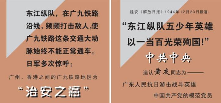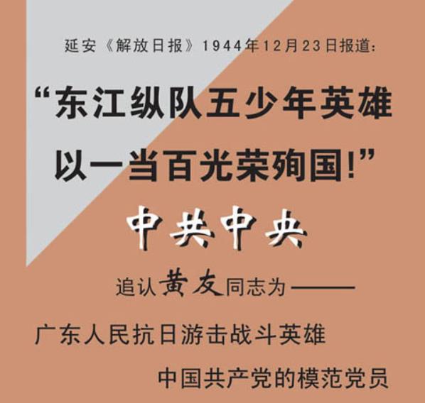 "东江纵队五少年英雄以一当百光荣殉国!"中共中央追认黄友同志为----- 广东人民抗日游击战斗英雄中国共产党的模范党员