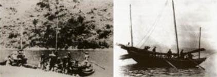 日军开辟了从广州经香港往汕头的近海航线, 海上队以渔港为基地,在大鹏湾、 大亚湾和九龙半岛的外海,护航大队和港九大队的海上队,展开破坏敌海上运输的战斗。从1944年夏至抗战胜利,共俘敌船43艘,击沉7艘。图为海上队基地大鹏半岛南澳港和九龙半岛东岸粮船湾。