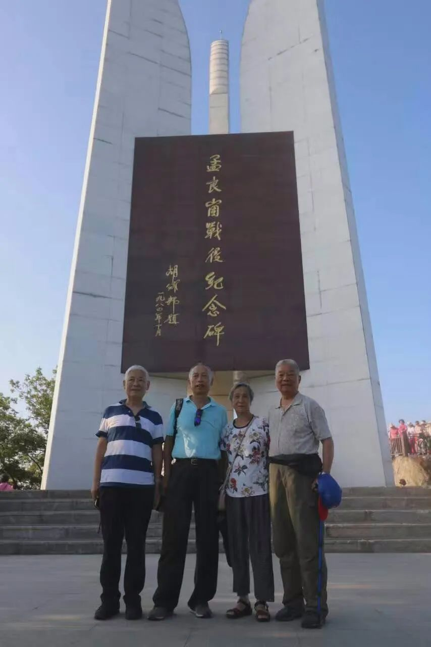 作者梁凯鹰(左2,东江纵队后代联谊会、东江纵队历史研究会会员)与妹夫(左1)、妹妹梁欣红及父亲的战友、长征老红军、珠纵副司令员、北撤九人委员会成员、开国空军少将谢斌之女杏流大姐夫婦一起在山东孟良崮战役纪念碑前合影